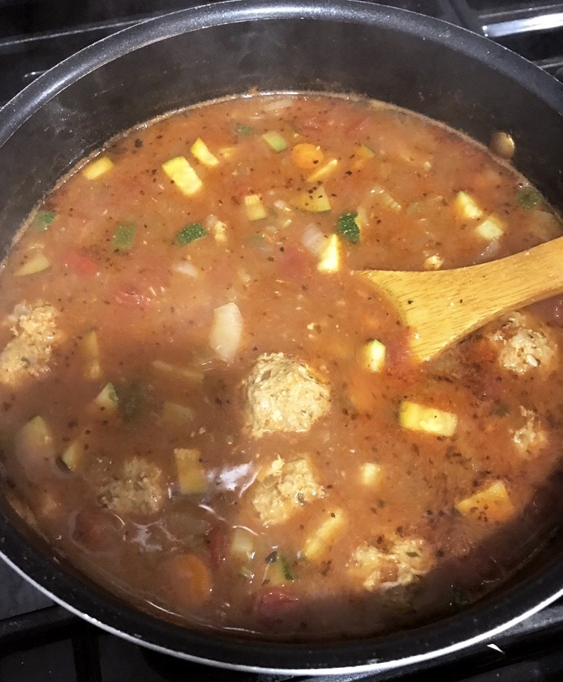 • Sometimes I get lazy to make meatballs and will instead make a “Taco Soup.” When cooking that version, I use the whole onion in the soup (instead of 1/2 that was used in the meatball), and add the ground meat at step 2 and cook it through.